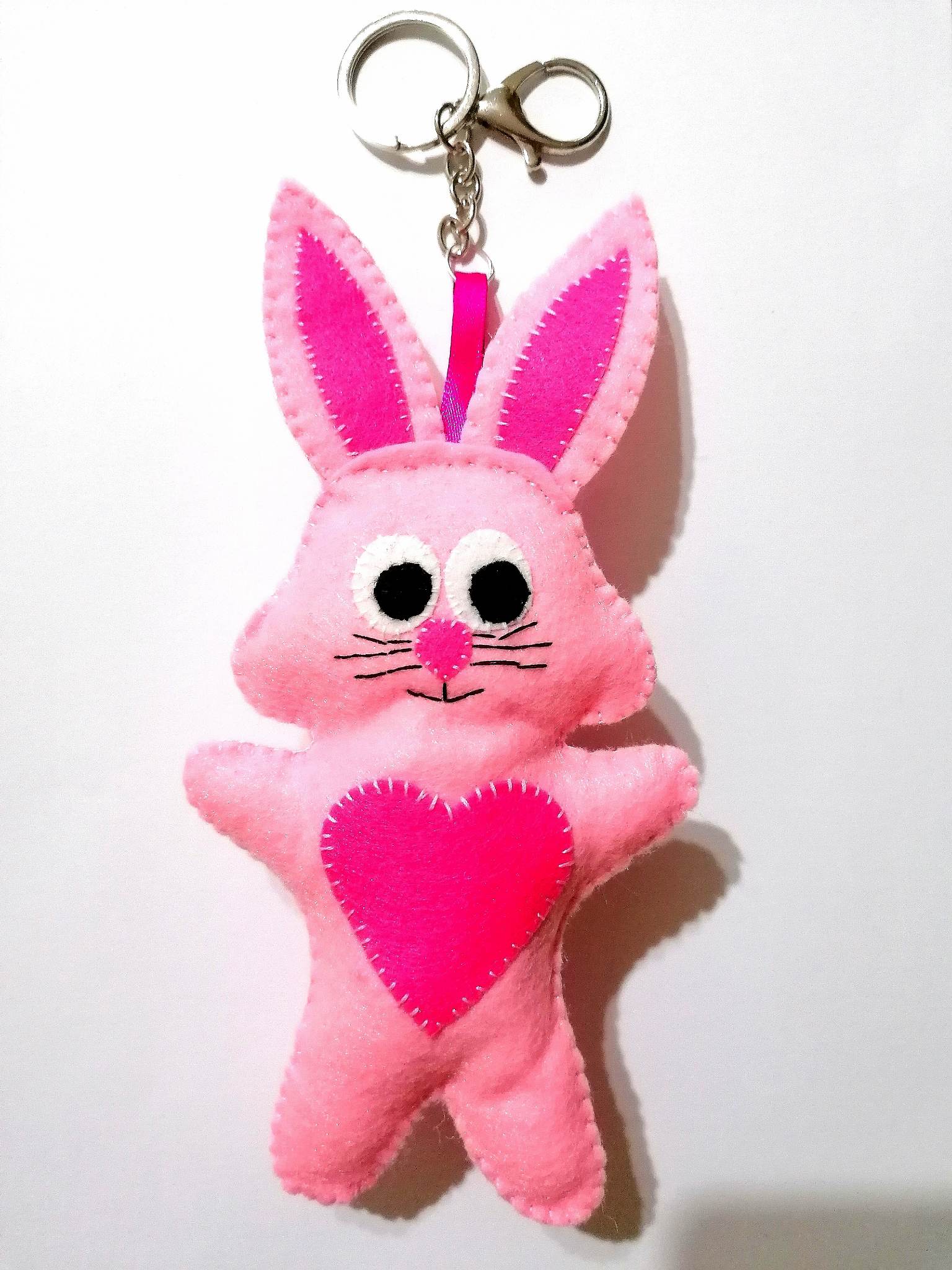 Breloc iepuras roz. Iepurasul este confectionat din fetrusi are lungimea de 19 cm. Este umplut cu puf antialergic. Are atasat atat accesoriu pentru breloc cat si carabina de prins la geanta sau ghiozdan. Este un bun prieten si va pazeste de tristete.