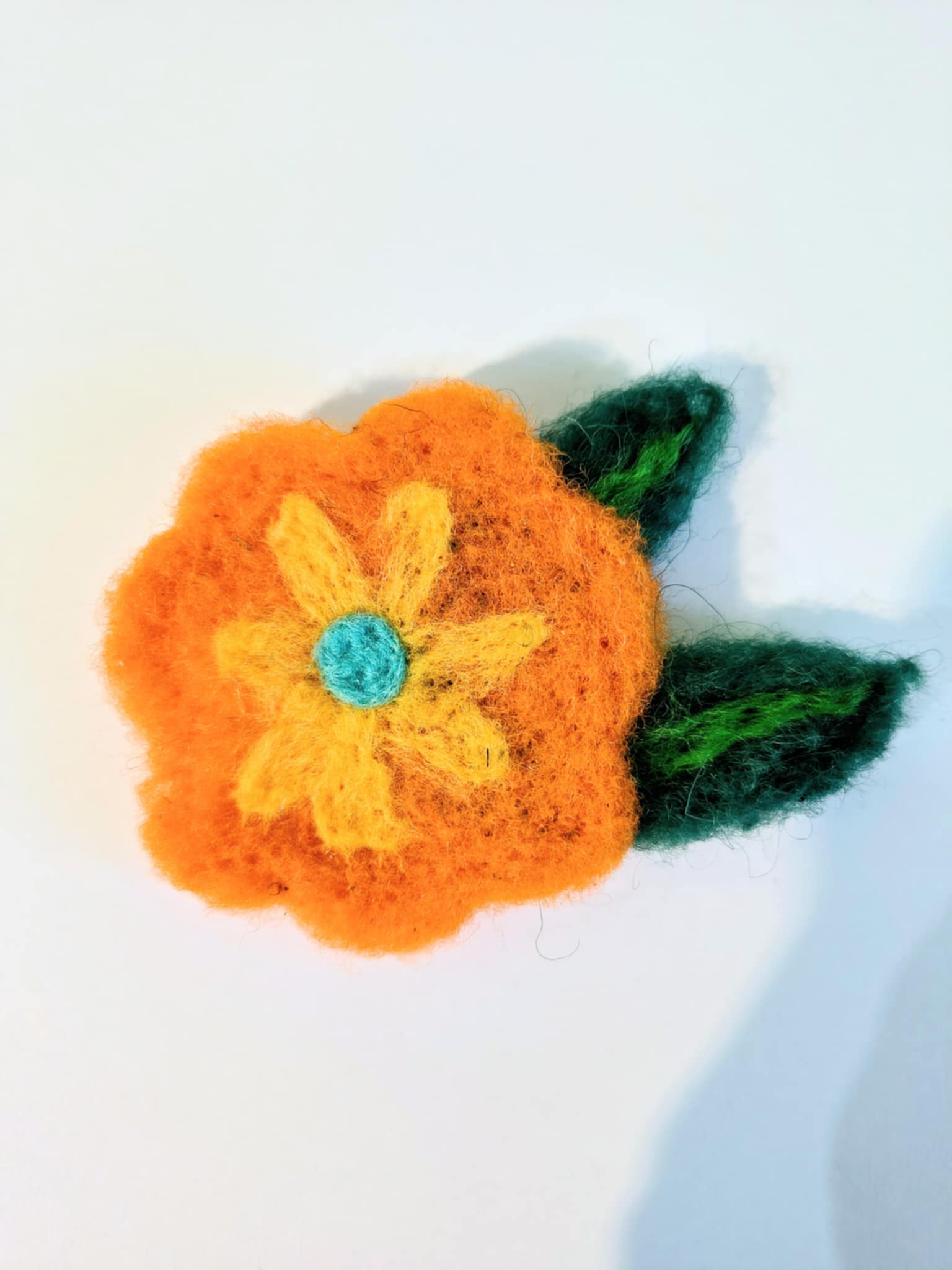 Broșă floare de câmp portocalie. Broșă din lână împâslită. Are diametrul de aproximativ 6 cm. Are ac de prindere tip broșă. Ne aduce aminte de vară și de mireasma câmpului. Dă ținutei un aer cald și apropiat.