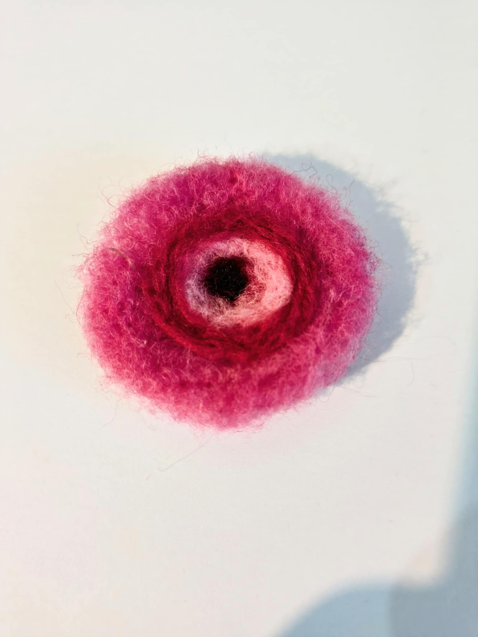 Broșă roz din lână. Broșă din lână împâslită. Are diametrul de aproximativ 5 cm. Are ac de prindere tip broșă. Ne aduce aminte de vară și de mireasma câmpului. Dă ținutei un aer cald și apropiat.