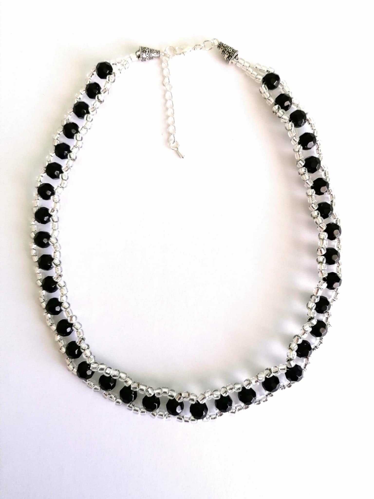 Colier ajurat negru cu argintiu. Colier la baza gatului din margele argintii de 4 mm si cristale negre de 10 mm. Poate fi purtat la aproape orice tinuta dand o nota de eleganta si mister. Colierul are lantisor de prelungire pentru a se putea adapta lungimea.