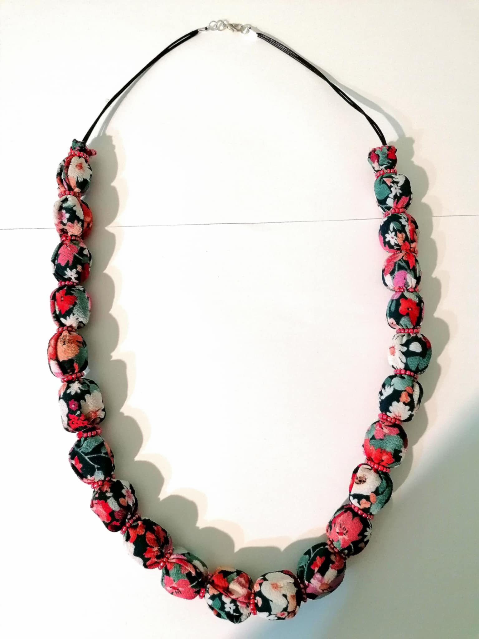 Colier textil multicolor. Colier din margele mari din lemn acoperite cu material floral multicolor. Margelele din lemn unt insirate pe snur iar sistemul de inchidere este tip carabina. Colierul are o lungime medie. Este potrivit pentru o tinuta de zi. Este original si unic. Nu stiu daca va fi dispomibil multa vreme.