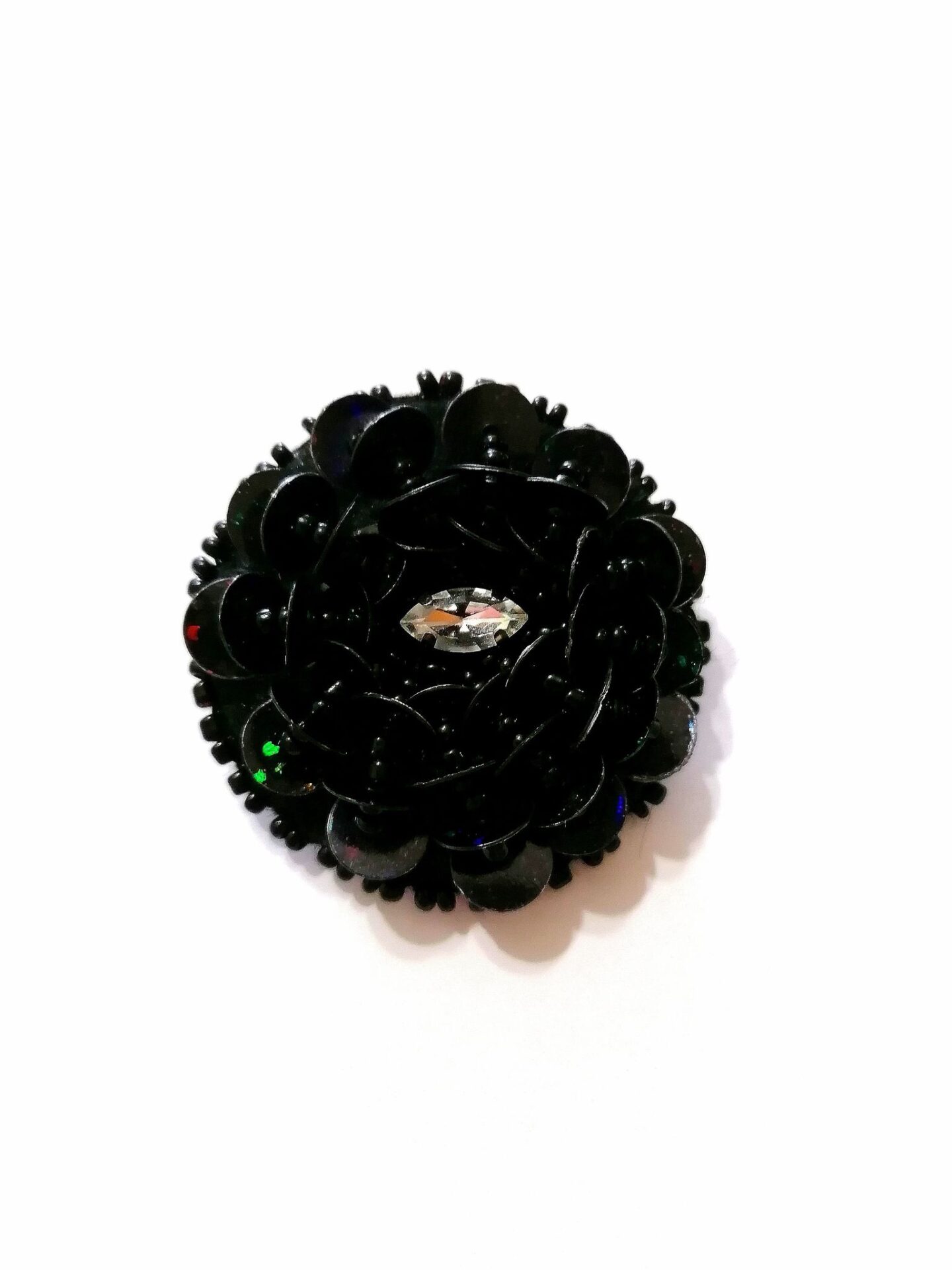 Brosa neagra cu paiete. Brosa este cusuta cu paiete negre cu irizatii multicolore pe o baza din fetru. Este dublata cu fetru si are ac de prindere tip brosa. Diametrul maxim este de aproximativ 4 cm. Poate fi purtata la o rochie de seara.