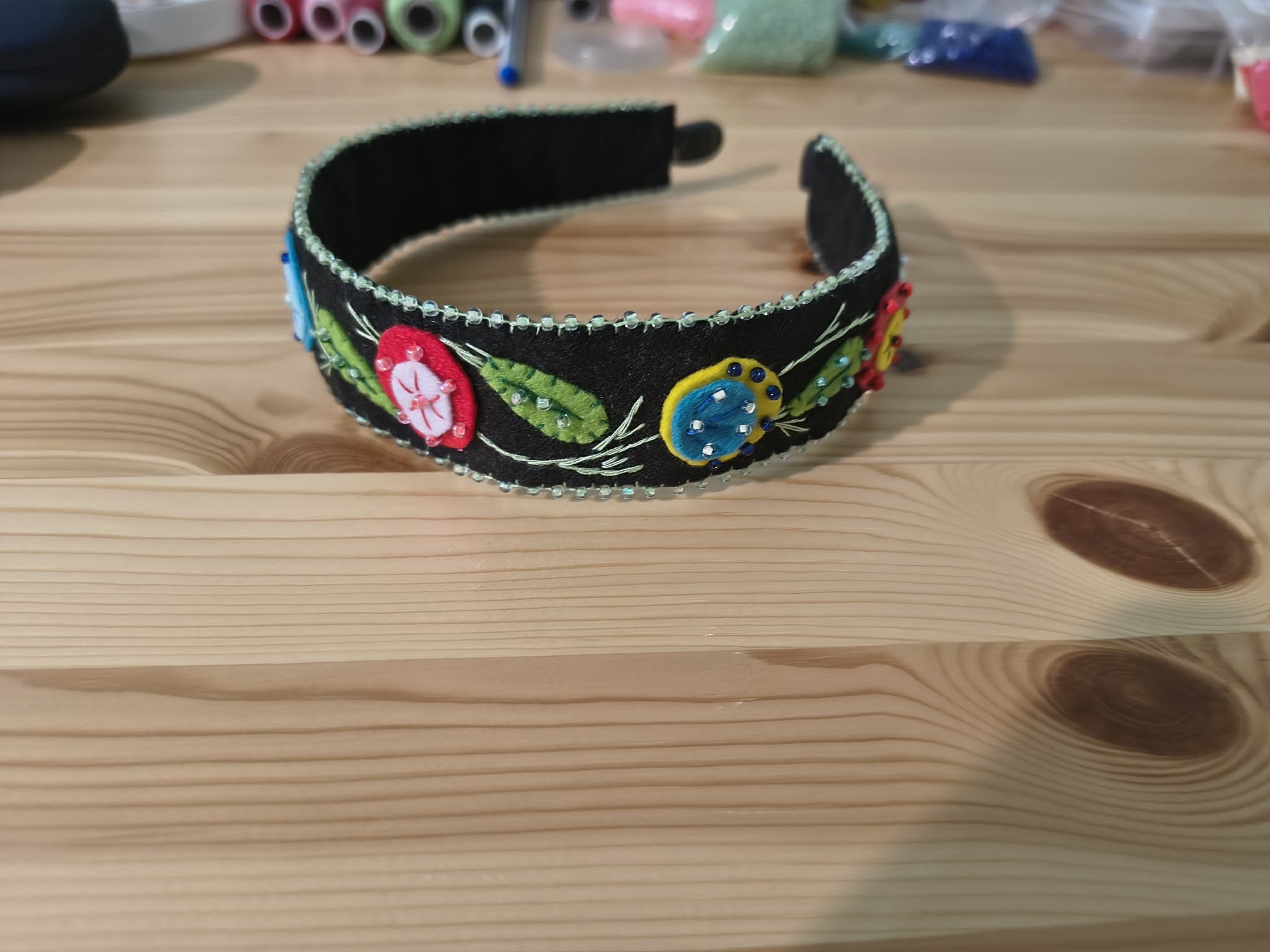 Diadema cu flori multicolore. Diadema are o baza metalica imbracata in fetru cusut cu margele. Latimea maxima a bentitei de fetru este de 3 cm. Modelul multicolor este vesel. Poate da farmec oricarei tinute.