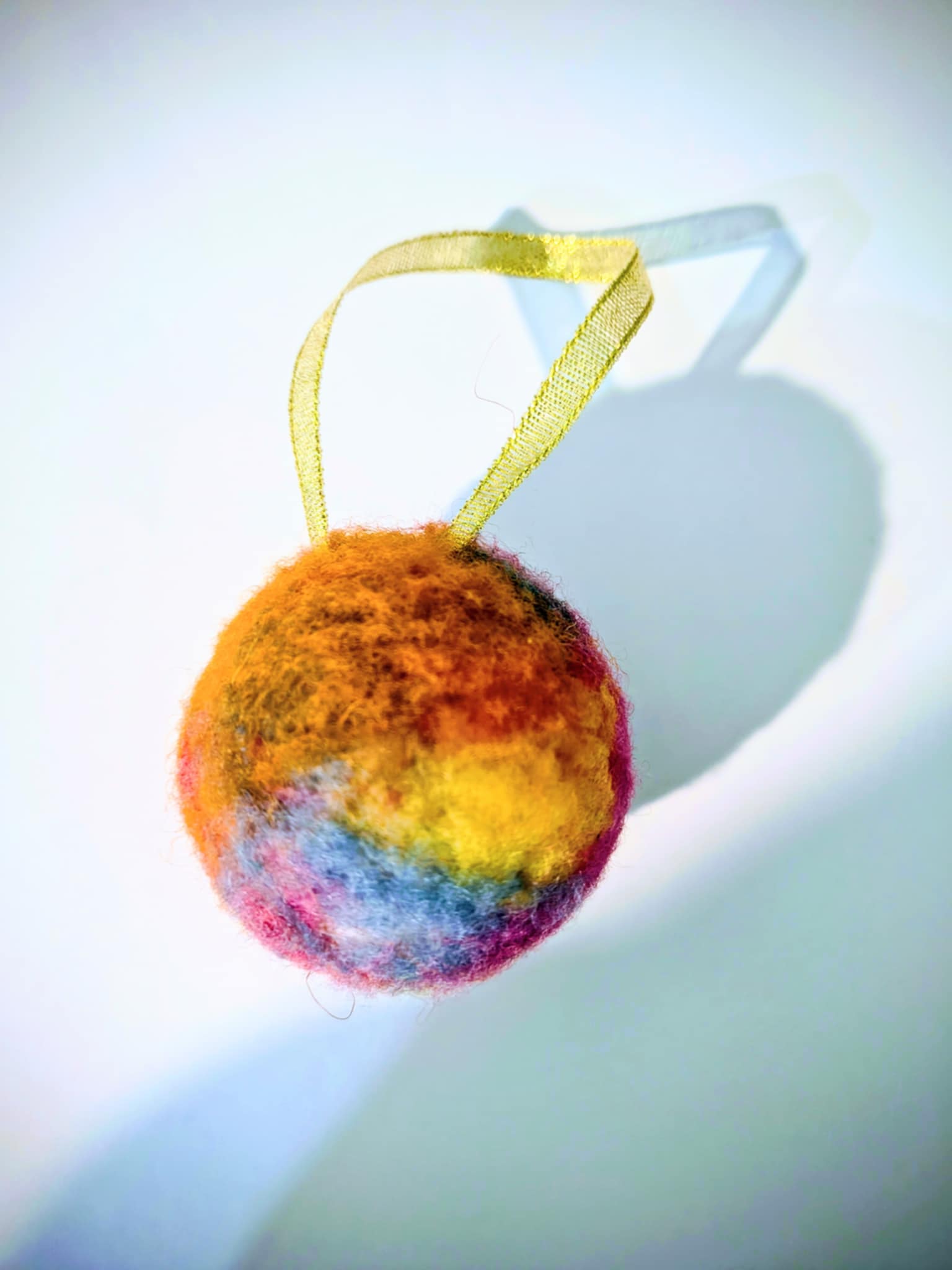 Glob multicolor din lână împâslită. Este ca un vis la gura sobei din copilărie. E cald, pufos și prietenos. Are diametrul de aproximativ 7 cm și este confecționat dintr-un glob din polistiren pe care am împâslit lână de diferite culori.