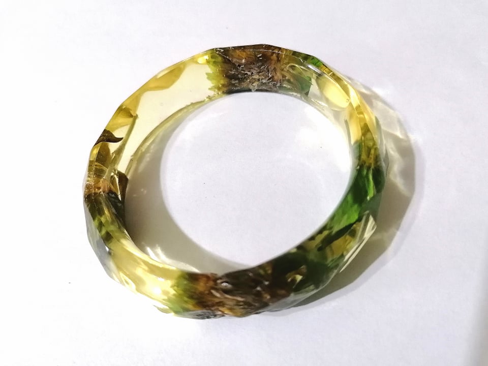 Bratara din rasina epoxidica cu trifoi. Bratara are in interioar flori si frunze de trifoi incorporate in rasina epoxidica. Bratara este potrivita pentru o mana mica sau medie.