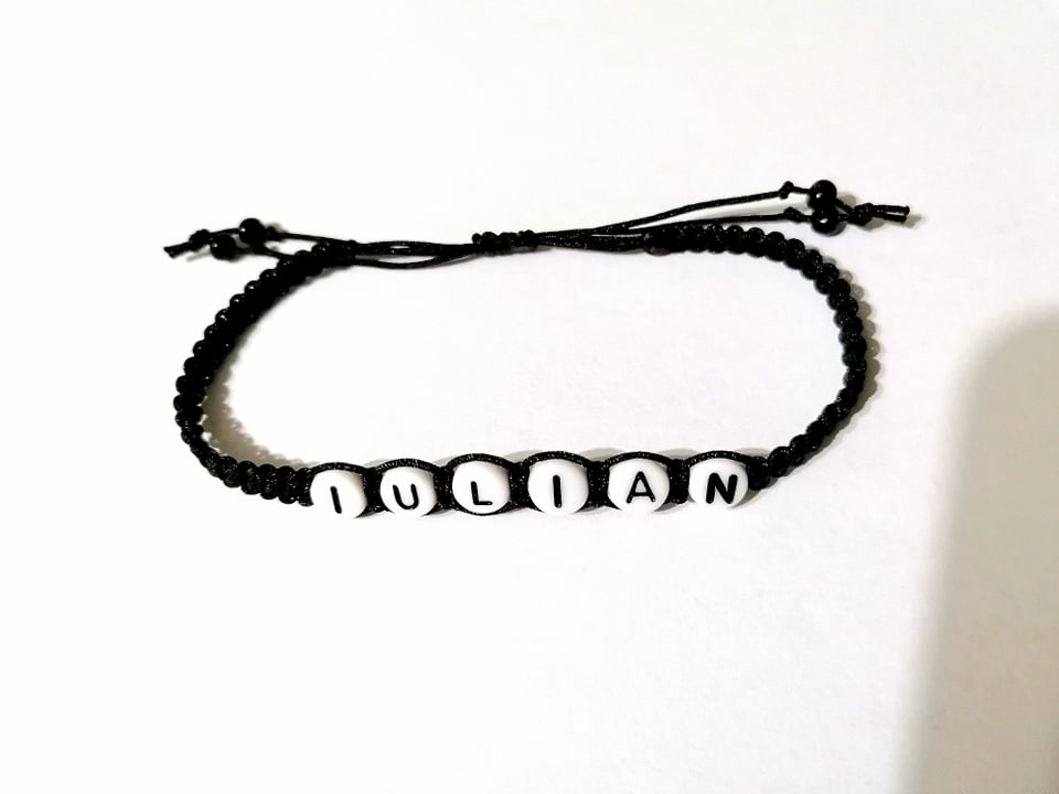 Bratara neagra impletita IULIAN. Grosimea snurului este de 1 mm iar latimea impletiturii este de 4 mm. Diametrul unei litere este de 7 mm. Bratara este reglabila, marime pentru adulti.