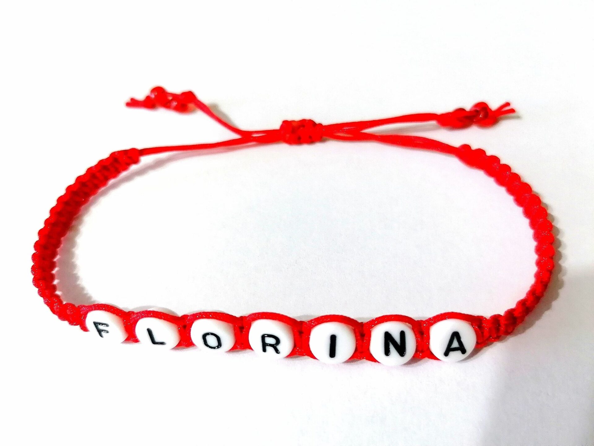 Bratara rosie impletita FLORINA. Grosimea snurului este de 1 mm iar latimea impletiturii este de 4 mm. Diametrul literei este de 6 mm. Bratara este reglabila, marime pentru adulti. Poate fi confectionata si cu snur de alta culoare (negru, grena, albastru, bleumarin, gri, roz deschis, roz somon, mov, fucsia, verde, vernil, kaki, turcoaz, bleu, lila, mustar, galben) daca solicitati.