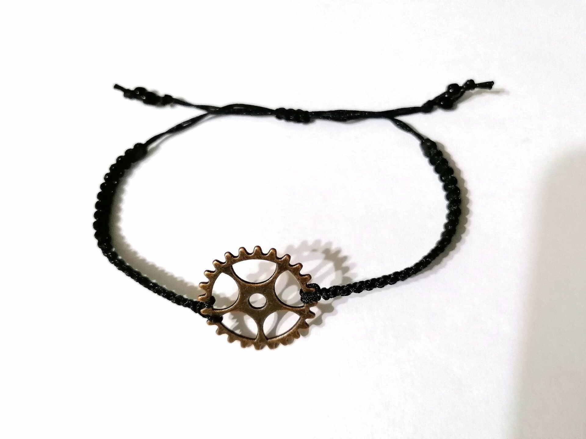 Bratara cu simbol mecanism de ceas din cupru. Grosimea snurului este de 1 mm iar latimea impletiturii este de 4 mm. Diametrul simbolului este de aproximativ 2 cm. Bratara este reglabila, marime pentru adulti. Poate fi confectionata si cu snur de alta culoare (rosu, grena, albastru, bleumarin, gri, roz deschis, roz somon, mov, fucsia, verde, vernil, kaki, turcoaz, bleu, lila, mustar, galben) daca solicitati.