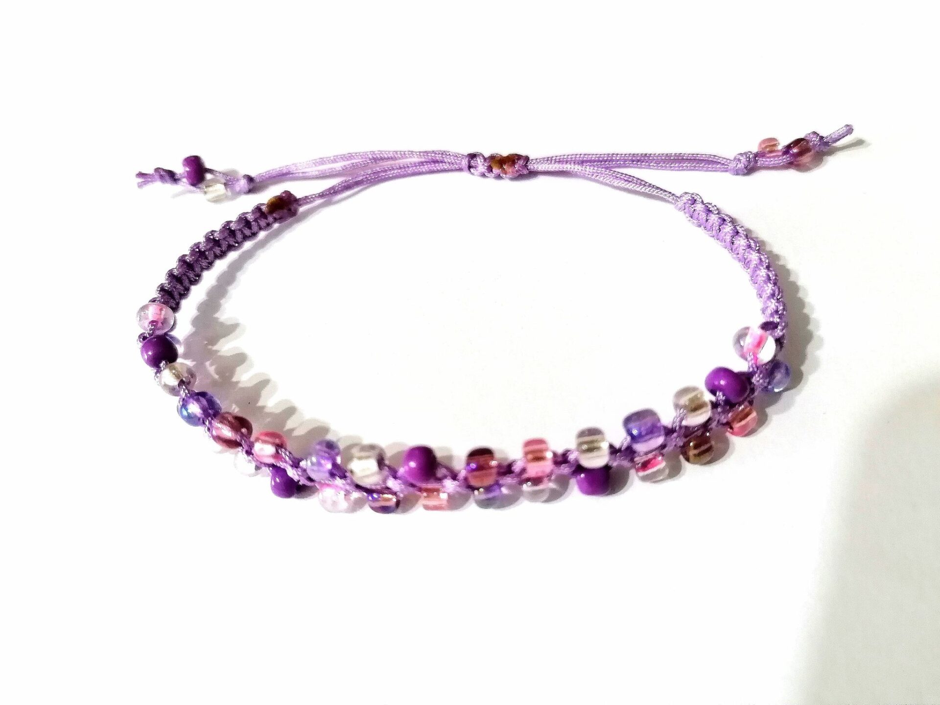 Bratara impletita lila cu margelute asortate. Grosimea snurului este de 1 mm iar latimea impletiturii este de 4 mm. Bratara este reglabila, marime pentru adulti. Poate fi confectionata si cu snur de alta culoare (rosu, grena, albastru, bleumarin, gri, roz deschis, roz somon, mov, fucsia, verde, vernil, kaki, turcoaz, bleu, lila, mustar, galben) si margelute asortate pentru culoarea respectiva daca solicitati.