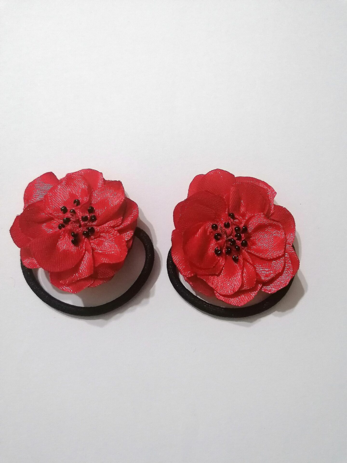 Pereche de elastice pentru par cu flori rosii. Florile sunt cusute pe o baza din fetru. Elasticul este bine prins intre cele doua fete din fetru. Diametrul unei flori este de aproximativ 5 cm.