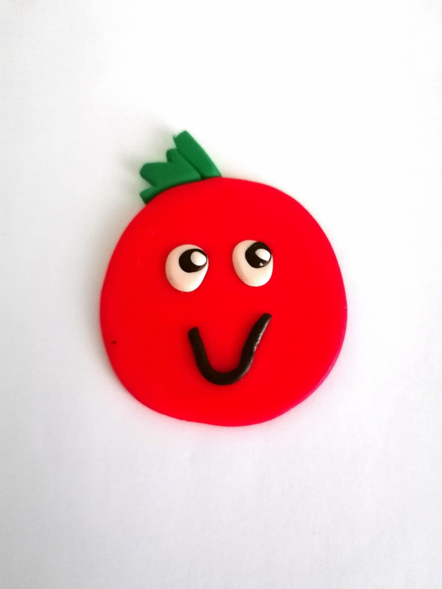 Magnet de frigider Tomata timida. Este realizat din fimo. Are diametrul de aproximativ 4,5 cm. Ar vrea sa spuna o poveste… dar nu indrazneste. Daca va fi asezat acolo unde isi doreste poate incepe sa depene povestea.
