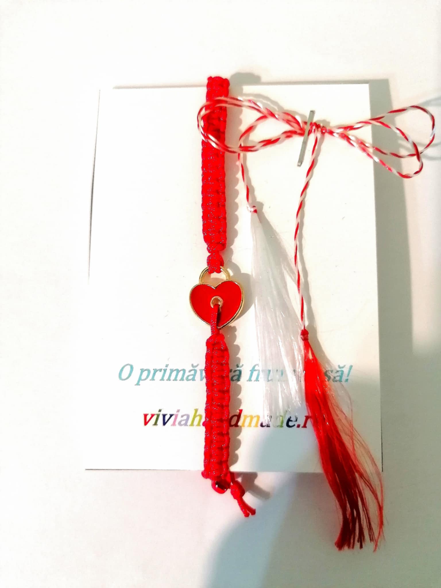 Martisor bratara cu lacat in forma de inimioara. Bratara este reglabila, marime pentru adulti. Grosimea snurului este de 1mm iar latimea impletiturii este de 4 mm.