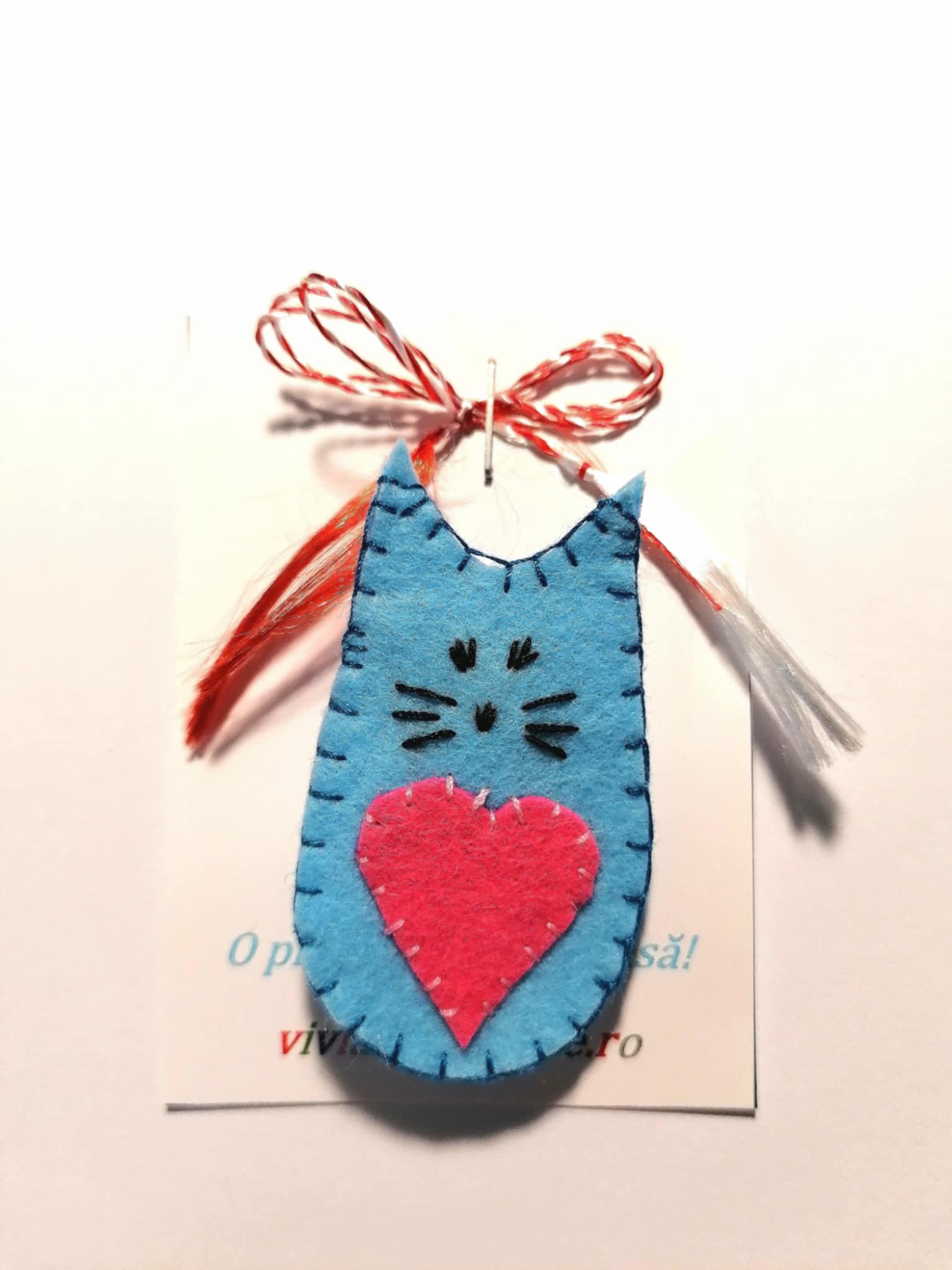 Mărțișor pisicuță bleu. Mărțișor din fetru în formă de pisicuță. Are ac de prindere tip broșă. Lungimea este de 5 cm. Este un mărțișor prietenos cu mediul deoarece a fost confecționat din materiale rămase de la croitul jucăriilor.
