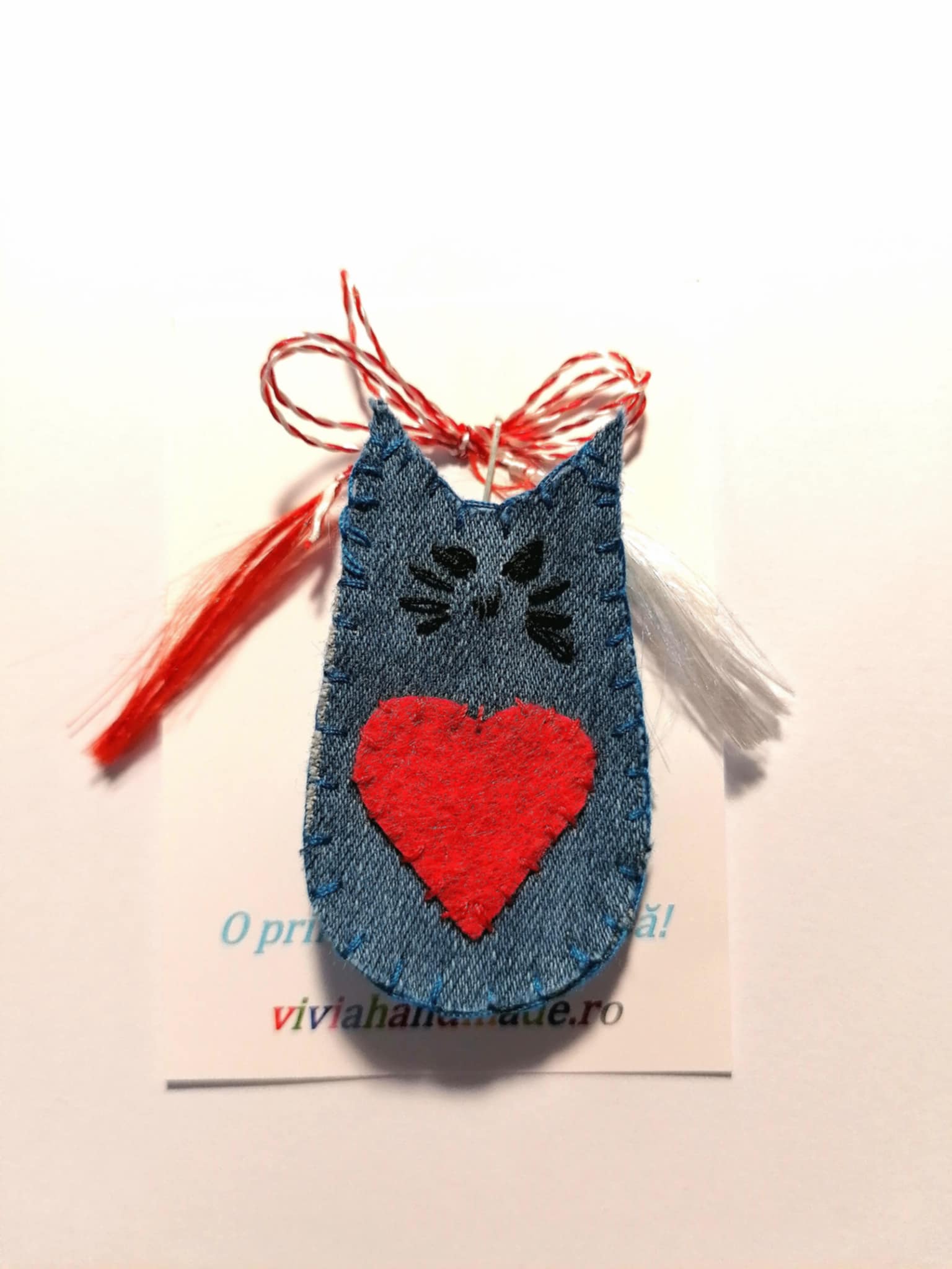 Mărțișor pisicuță din denim. Mărțișor din denim în formă de pisicuță. Are ac de prindere tip broșă. Lungimea este de 5 cm. Este un mărțișor prietenos cu mediul deoarece a fost confecționat din materiale reciclabile.