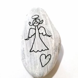 Piatra pictata in culori acrilice. Imaginea reprezinta un coltisor de sat. Lungimea maxima a pietrei este de 12 cm iar latimea de 8 cm. Piatra se livreaza cu suport pentru sustinere.