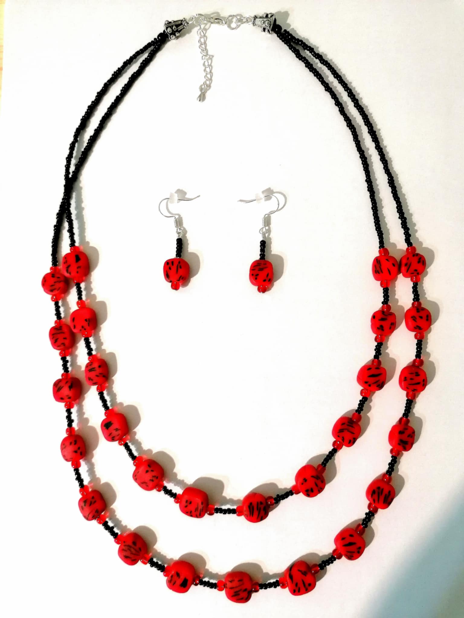 Set rosu-negru cu margele din fimo. Colierul are lungime medie si este format din doua siruri de margele. Fiecare sir este format din margelute negre de 2mm si margele din fimo de aproximativ 1,5 cm. Setul este unicat si poate fi purtat la o tinuta de zi sau la o tinuta de seara mai putin conventionala.