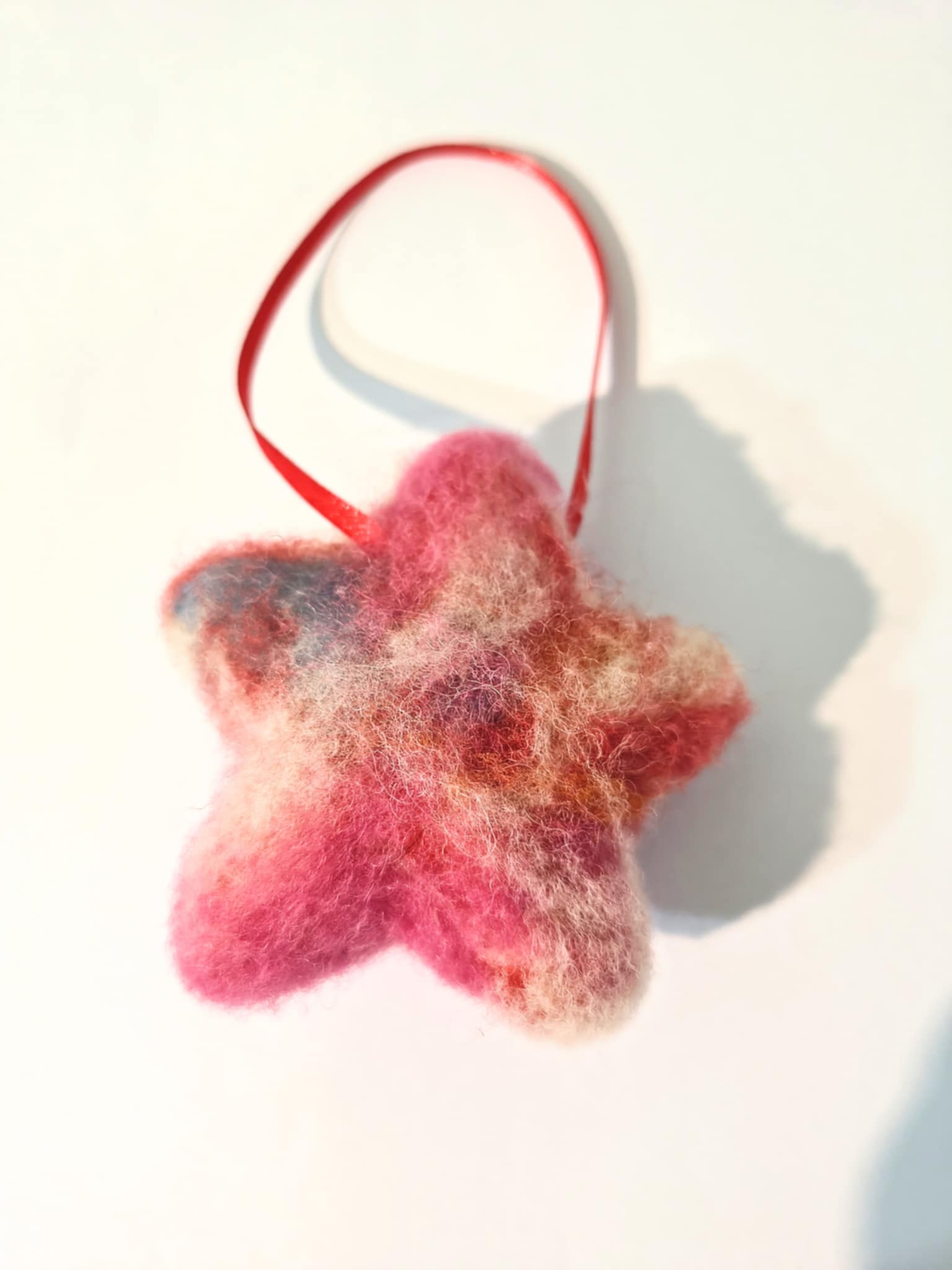 Steluță din lână împâslită. Steluță din polistiren pe care am împâslit lână multicoloră. Diametrul maxim este de 7 cm. Este originală, unică. Decorațiunile din lână împâslită creează o atmosferă deosebită, mult mai caldă și prietenoasă.